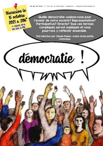 Quelle démocratie voulons-nous pour l'avenir de notre société ? Représentative ? Participative ? Directe ? Tous ces termes compliqués seront expliqués et nous pourrons y réfléchir ensemble. Introduction par Claude Kaiser, maire d'une petite commune. Pour celles et ceux qui le souhaitent, repas tiré du sac à 19h.