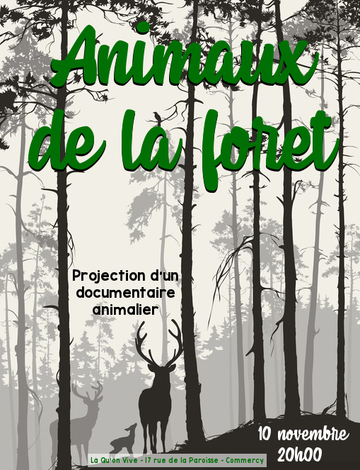 Mercredi 10/11, projection d’un documentaire animalier sur les animaux de la forêt à 20h, précédé par un repas tiré du sac à 19h30.