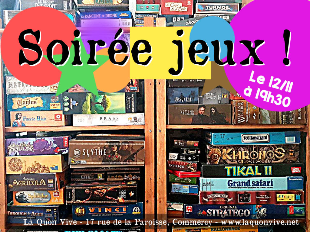 12/11 – Soirée jeux de société ! 10 novembre 2021 laquonvive Agenda Ce vendredi à 19h30, à l’abri du froid et pour ouvrir le week-end avec convivialité, un repas tiré du sac et des jeux de société pour petits et grands, pour jouer sans modération !