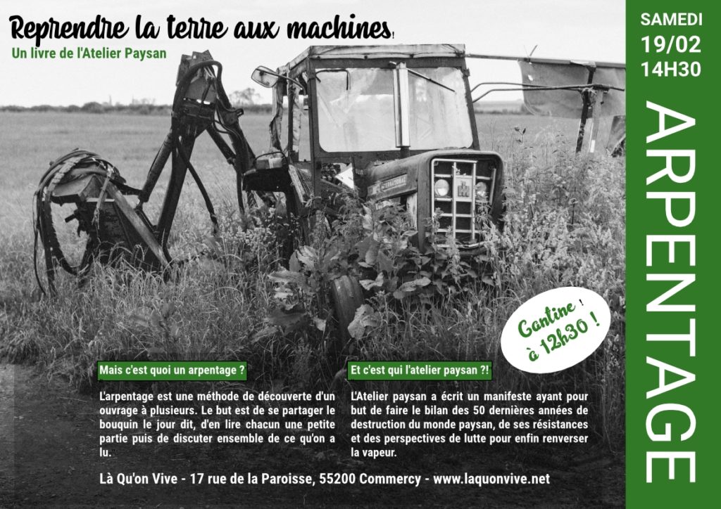 Vous pouvez trouver plus d'info sur le livre ci-dessous : https://www.seuil.com/ouvrage/reprendre-la-terre-aux-machines-l-atelier-paysan/9782021478174 https://www.monde-diplomatique.fr/2021/09/VIDAL/63471