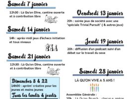 Programme Janvier 2023 ! Tout juste sorti du four, notre beau programme de janvier ! Et un rappel : la fabuleuse cantine fait son retour ce samedi 7 janvier...